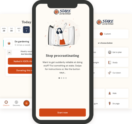 Everyone procrastinates about something - weight loss, exercise, study, learning an instrument or growing a business - and Stake Something stops you procrastinating. You spell out what you intend to do each week, then put something at stake - usually money - in which case you get suddenly reliable.